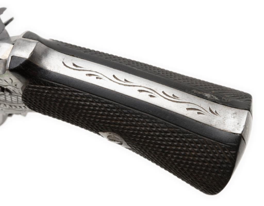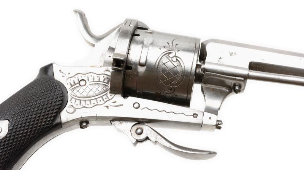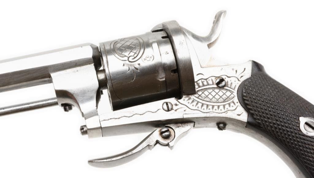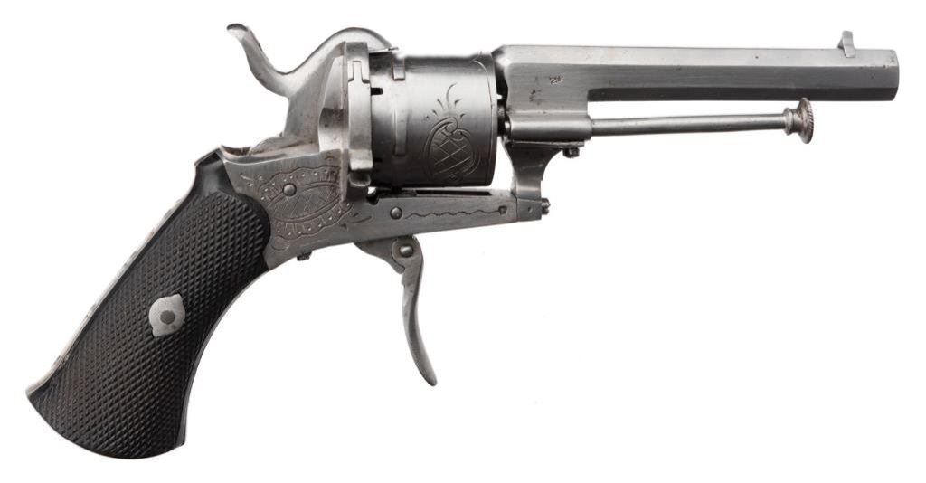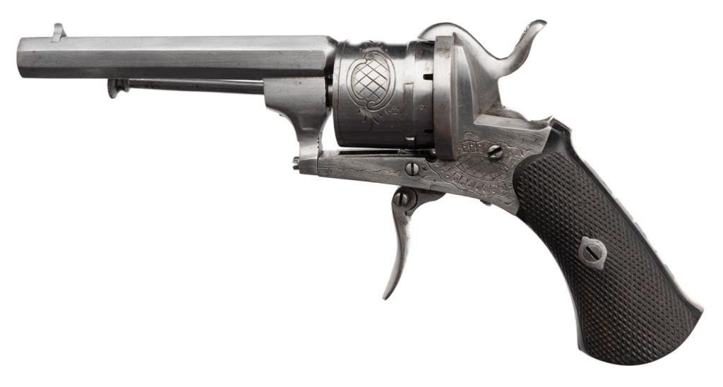 Pinfire revolver with folding trigger, 7mm caliber, 3.5” octagon barrel, no visible S/N, ca 1860’s-1870’s; bright polish, good action and very good grips. Est.: $150-$300.