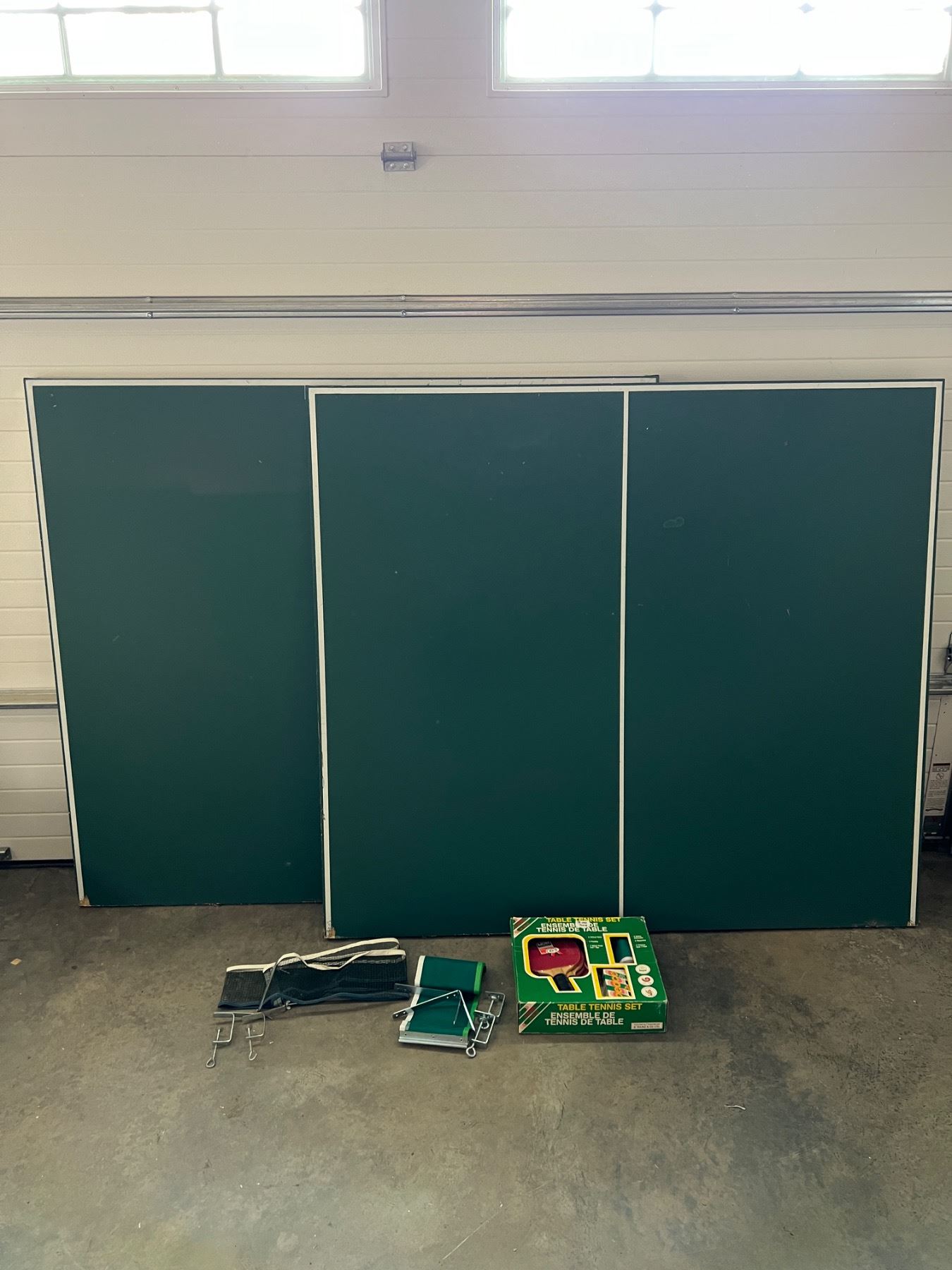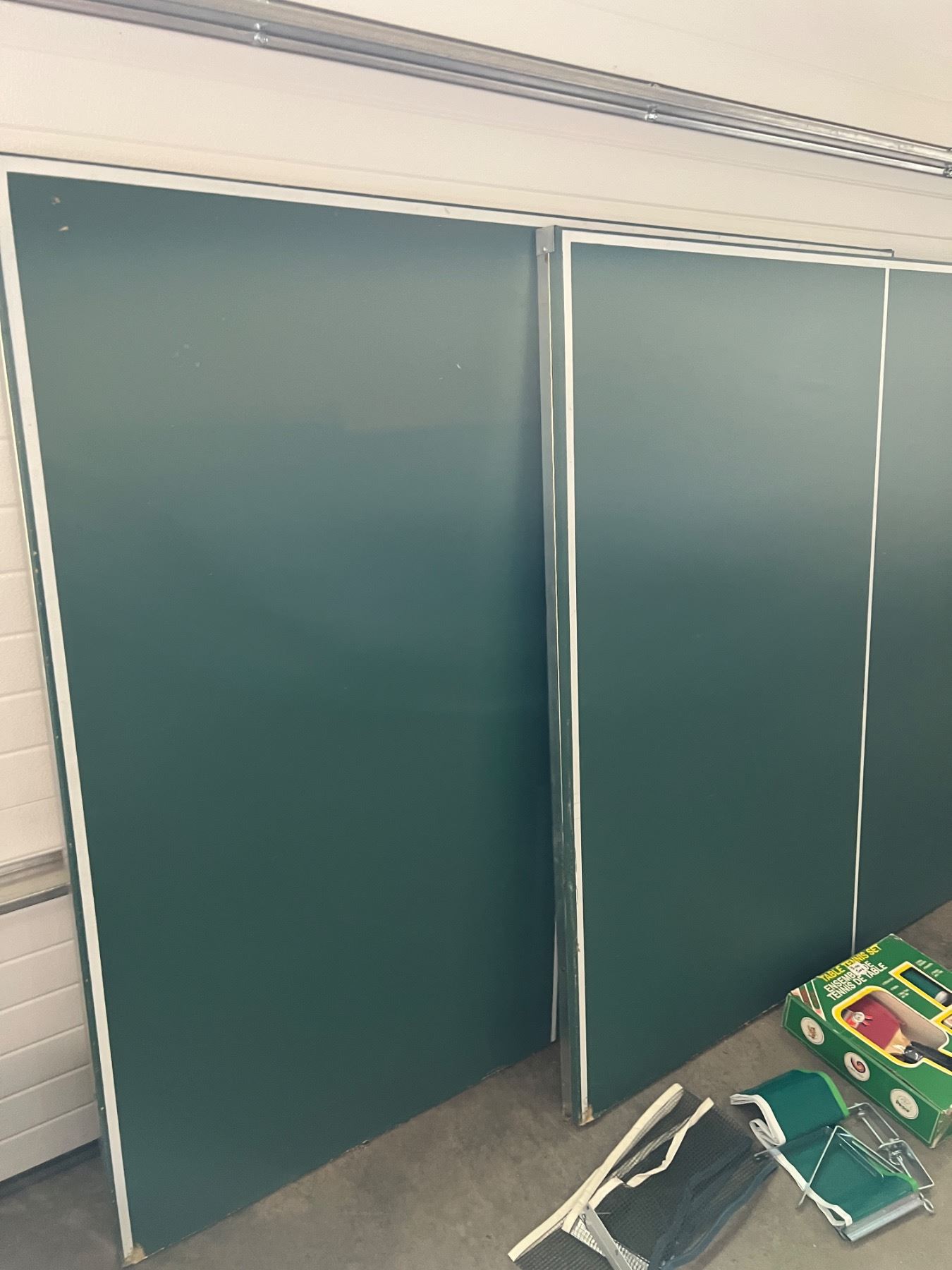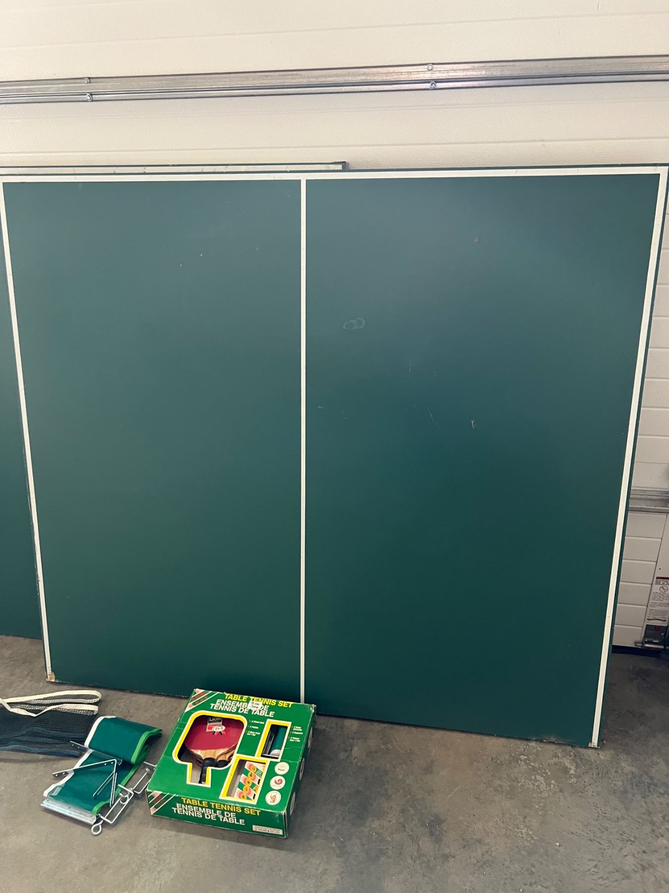 Full size ping pong table, currently not put together but each of the two pieces measure 60"W x 54"L, some chips and wear to the green paint