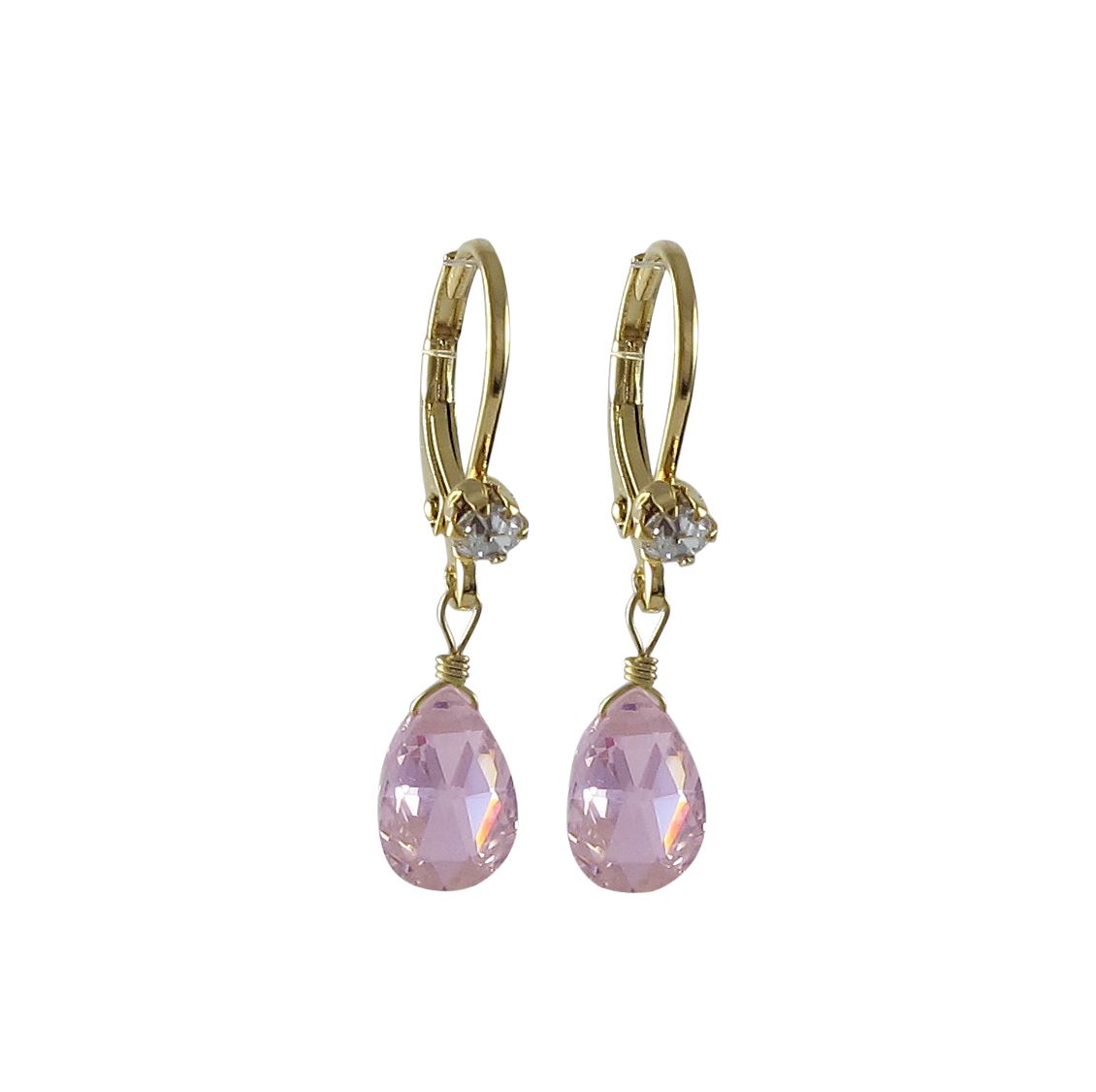 Pink 6X9 Teardrop CZ On Gold Tone Brass Lever Back With Crystal Earrings- 1.08"