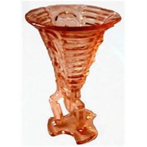 </font></strong>GUARANTEED ORIGINAL - Produced in Bohemia circa 1930 this salmon pink Depression glass Art Deco rocket vase features three angular legs, with a Machine Age shape, an outstanding flared chevron and parallel panel optic bowl. Measuring about 6 1/2 inches tall x 4 inches across the rim x about 2 1/4 inches across its triangular footed base and is in excellent condition</font>