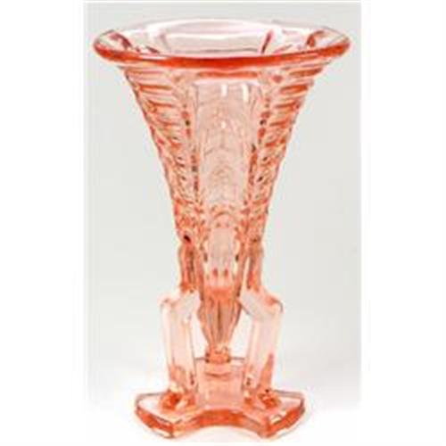 Produced in Bohemia circa 1930 this salmon pink Depression glass Art Deco rocket vase features three angular legs, with a Machine Age shape, an outstanding flared chevron and parallel panel optic bowl. Measuring about 6 1/2 inches tall x 4 inches across the rim x about 2 1/4 inches across its triangular footed base and is in excellent condition