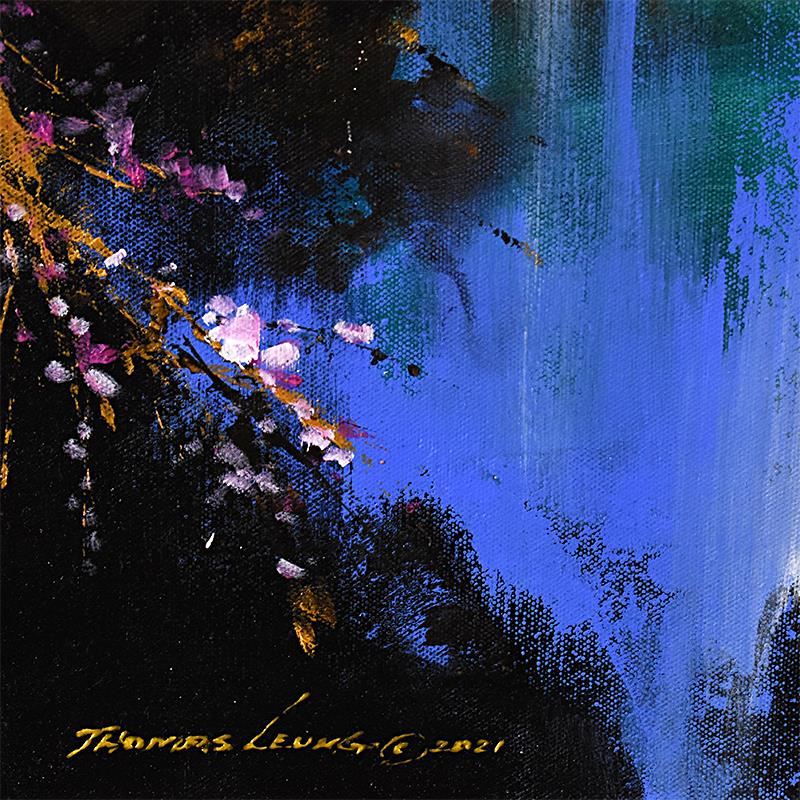 "Pink Blossom Under the Falls" is an original acrylic painting on canvas by Thomas Leung, hand signed by the artist. Includes Letter of Authenticity. Measures approx. 24" x 24" (image).