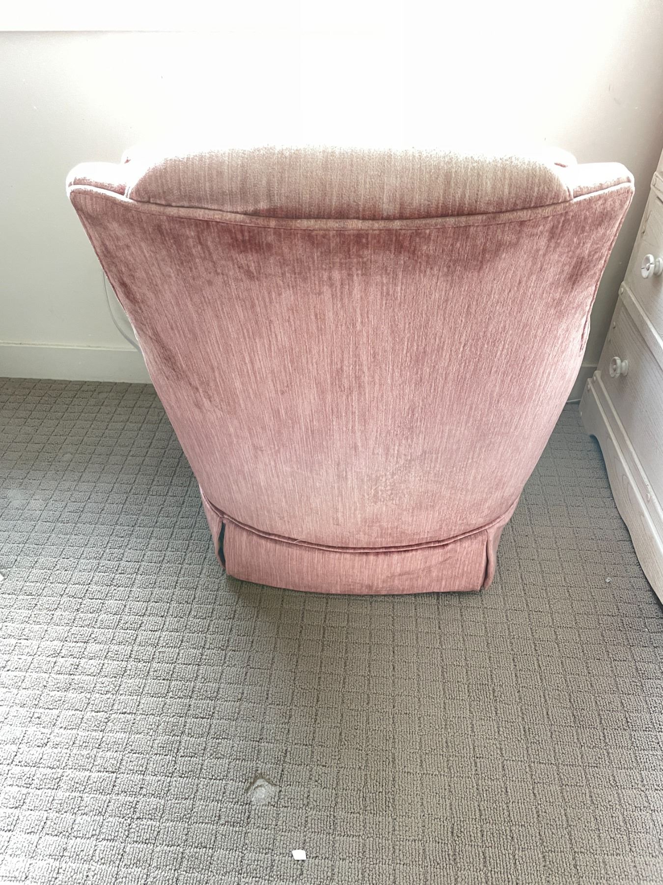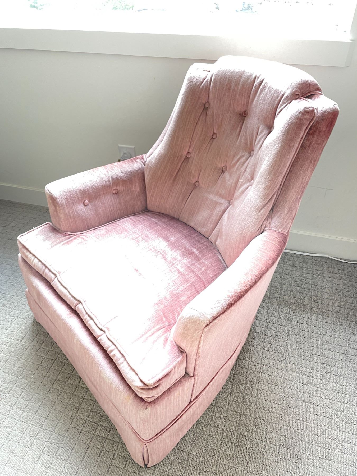Fabric has wear. Dimensions 33" height x 27" wide x 32" deep.