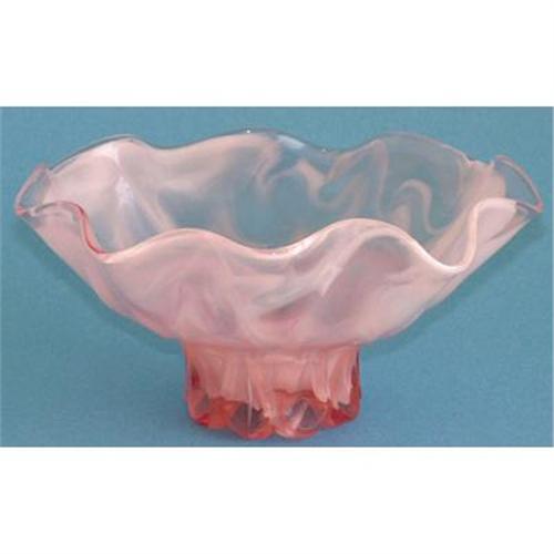 A beautiful cloud glass bowl with a transparent pink sculpted foot into which the striations of the opalescent paler pink "clouds" descend. It is 7 inches in rim diameter and about 3.25 inches in height, with a gently undulating rim. This lovely pink cloud glass bowl is in excellent condition, and is thought to be European in origin