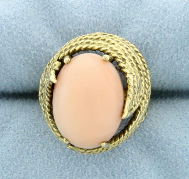In 14K yellow gold there is a 16x12mm oval pink coral. Size 5 9.5g