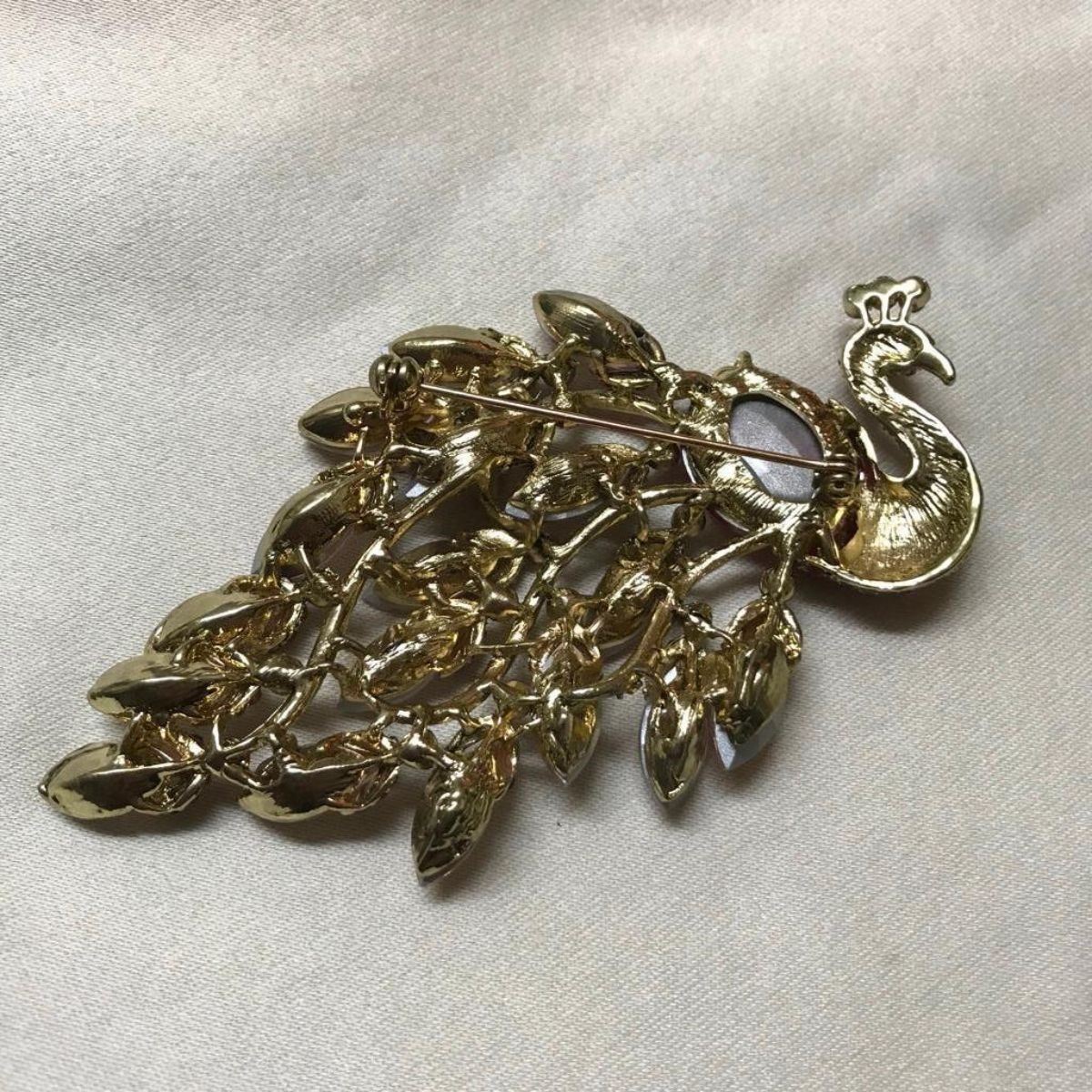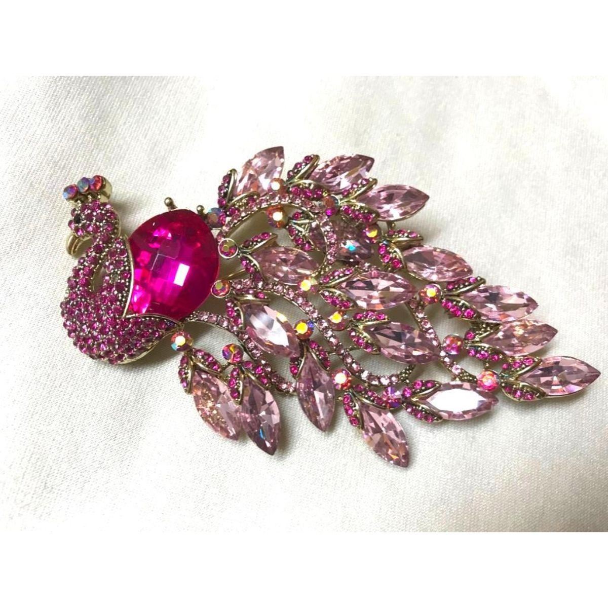 Large lovely oval checkerboard faceted pink focal crystal, surrounded by 16 large marquise faceted light pink crystals, with multiple smaller round pink crystals, set into a peacock bird-form gold-tone costume brooch pin. 4 1/4" L X 2 1/2" H.