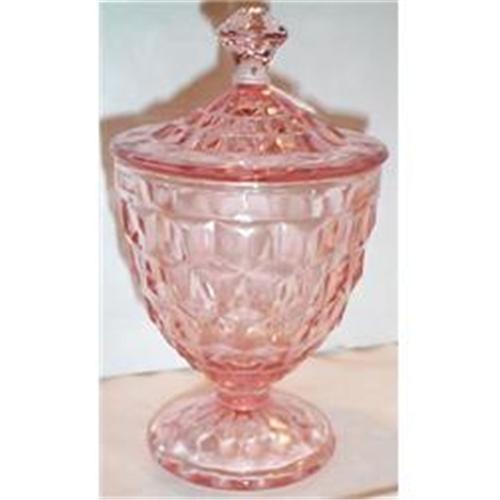 <tr><td>Title: Pink Cube Footed Covered Candy Depression</td></tr>