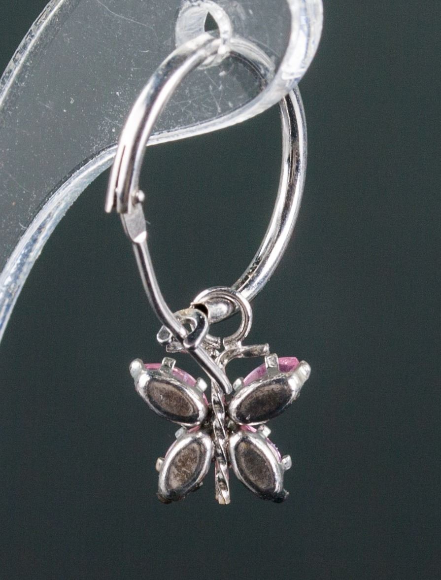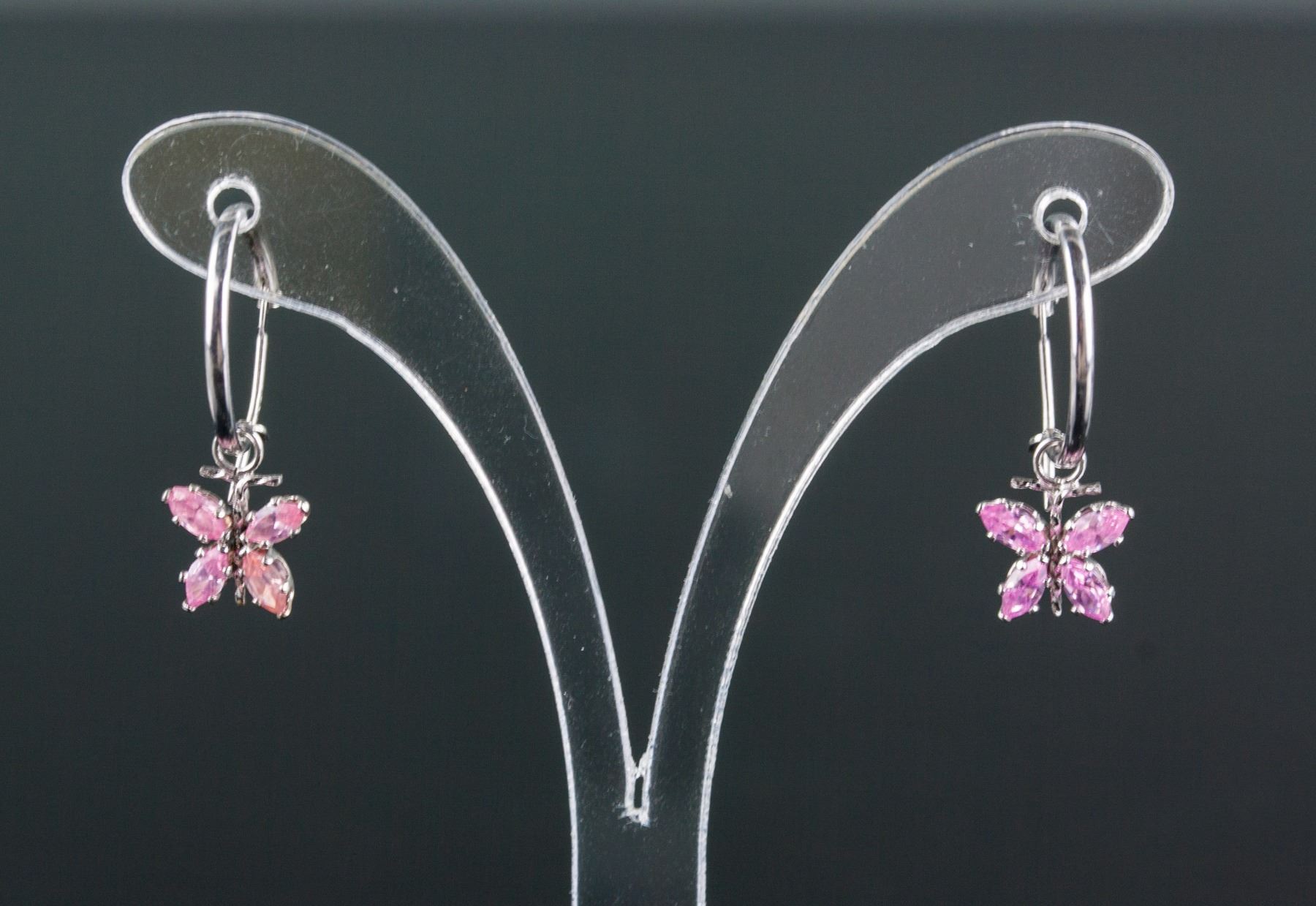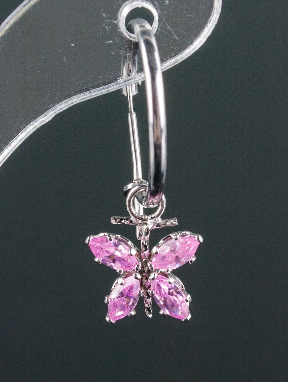Stamped 14k white gold butterfly hoop earrings; set with pink cubic zirconia; retail value $600; 0.9 cm x 0.8 cm, 2.65ct