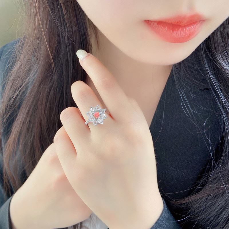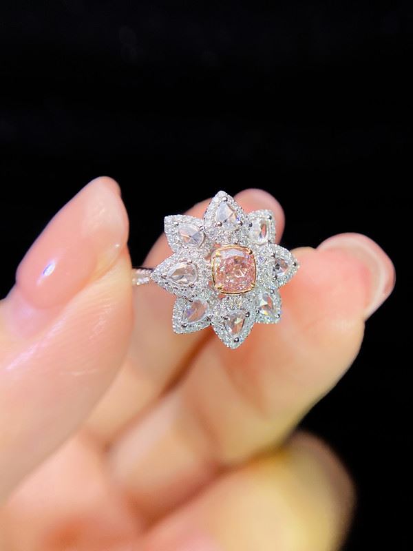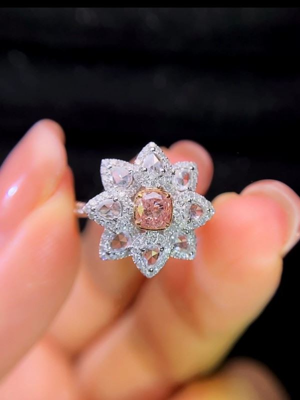 This ring features a pink cushion-cut center diamond surrounded by rose-cut teardrop diamonds that form a floral, petal-like silhouette. The soft pink hue of the center stone paired with the shimmering white diamonds creates a romantic, feminine, and luxurious look.Ring size: 6, circumference: 52 mm, diameter: 16.6 mm, main diamond: 0.32 ct, side diamonds: 0.615 ct. Note: Comes with a GIA Natural Diamond Report.