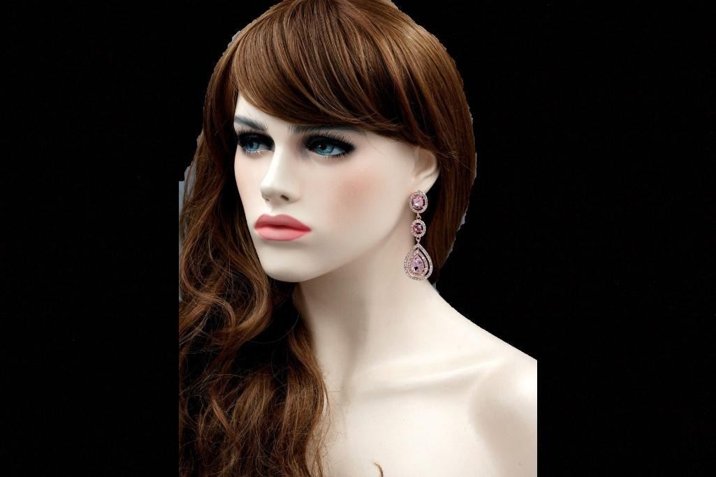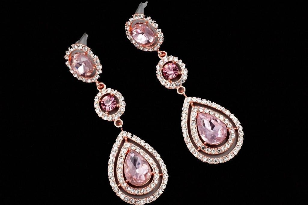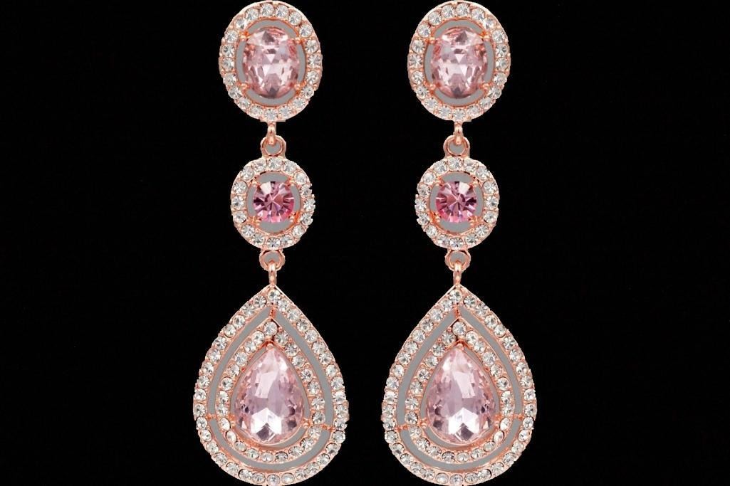 Pink Czech crystal teardrops surrounded by rhinestones dangle from round & oval shaped pink crystals surrounded by rhinestones, set into rose gold plated drop earrings. 2 3/4" L. 9786-031018-EB-07159