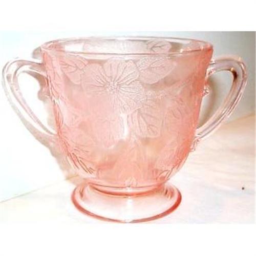 This very lovely Pink Footed Depression Glass Dogwood Sugar is in SUPERIOR condition with no chips, cracks, or dings. This measures 5" from handle to handle and is 3.25" in diameter and stands 3.50" tall.