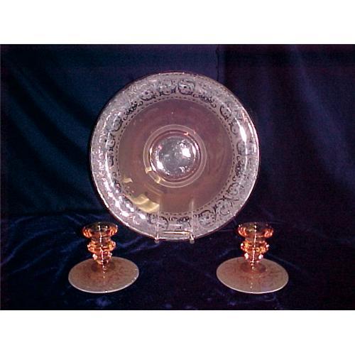 <tr><td>Title:Pink Depression Fruit Bowl and Candle Holders</td></tr>
