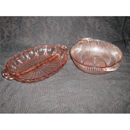 These are two beautiful Pink Depression glass from Hocking Glass. This is there 1936-1949 patterns,one is a Queen Mary handled bowl pink , also know as Prismatic Line ans Vertical Ribbed.Stands 2 3/4"tall by 9 1/2 across. I also have a pink depression glass divided relish dish in the Oyster and Pearl design. No chips or cracks in great shape. Thanks for stopping by.