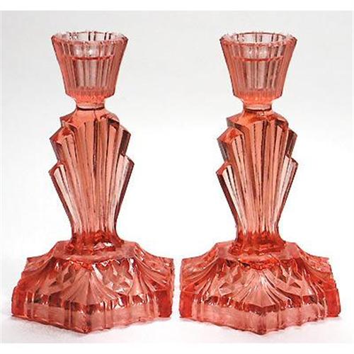 <tr><td>Title:Pink Depression Glass Art Deco Candlesticks</td></tr>