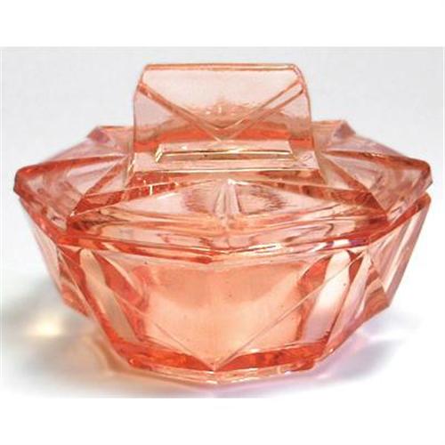 This pink Depression glass octagonal shaped Machine Age geometric designed Art Deco vanity or powder jar was produced circa 1920-1930s. This excellent example of Machine Age influence in Art Deco design measures about 2" tall x 3 1/2" across and is in excellent condition.