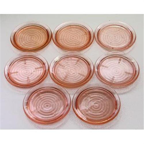 This set of eight(8) pink Depression glass coasters features a pressed pattern of concentric circles, measures 3 1/2 inches in diameter, and, with the exception of some mold roughness around the edges, are all in very good condition.