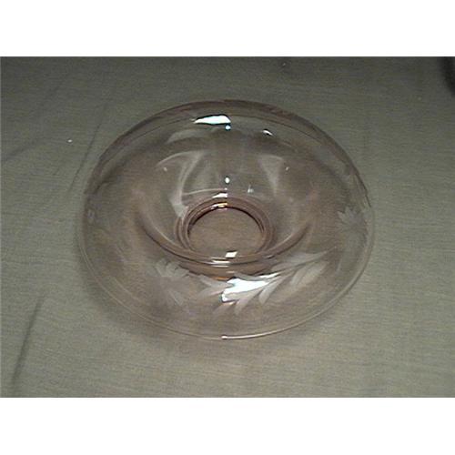 Elegant pink glass console in perfect condition. Rolled edge with etched daisy-like flowers. About ten inches in diameter and three inches deep.
