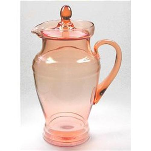 This lovely pink Depression glass 11 1/2 tall covered pitcher was produced with a sleek Art Deco shape. Attributed to the D.C. Jenkins Glass Co. or perhaps the Dunbar Glass Co. With the exception of a tiny chip on the lid [see photo - chip at about 9 O'clock], both the pitcher and lid are in excellent condition.