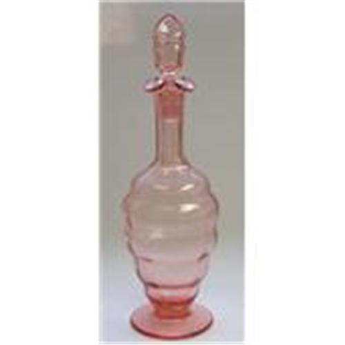 </font></strong>Produced during the 1920-1930s from pink Elegant Depression glass this decanter features a three pour spout and an undulating shape. Measuring 12 1/2 inches tall with both decanter and stopper in excellent condition.</font>