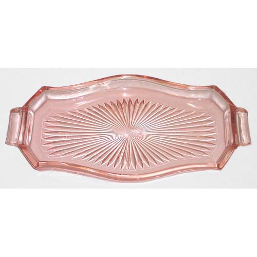 This beautifully designed pink Depression glass curvaceous vanity or dresser tray is attributed to and consistent with the vanity trays produced by the Paden Glass Co. during the 1930s. Measuring about 10 1/4" long including handles x 5 1/2" at its widest points this lovely Art Deco shaped vanity tray with handles and a cut spear pattern, is in excellent condition..
