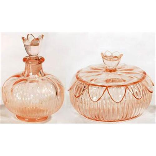 This is lovely pink Depression glass perfume bottle and dresser jar vanity set was produced during the 1930s. The bottle features a flower shaped stopper, the lid on of jar has a similar finial and also features a 12 petal like skirt - the bottle and jar are bulbous with prismatic rays. The jar measures about 3 1/2" in diameter and the bottle with stopper about 3 1/2" tall and is all in excellent condition