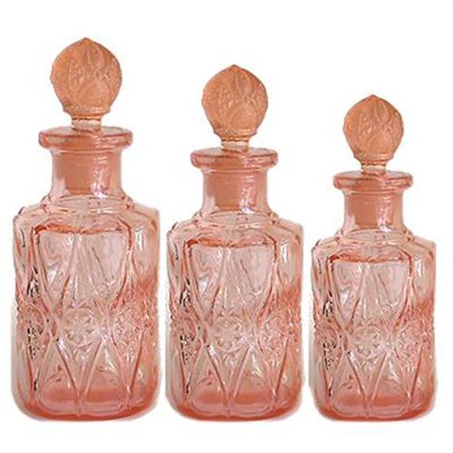 This set of three pink Depression glass perfume or dresser bottles feature an intricate crossed diamond pattern with flowers inside the diamonds. They are in graduating sizes, 6 /2" - 6" - 5". All three vanity bottles, including their ground glass stoppers, are in excellent condition.