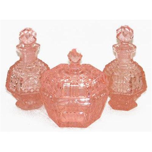 This pink Depression glass vanity set consists 2 perfume or cologne bottles and 1 powder box. The perfumes decanters measure 4 inches tall to top of their faceted ground stoppers and the powder jar is 3 1/2 inches tall x 3 1/4 inches wide. Hexagonal shaped with a cut pattern of stars and florals. All six pieces are without discernible damage and in excellent condition.