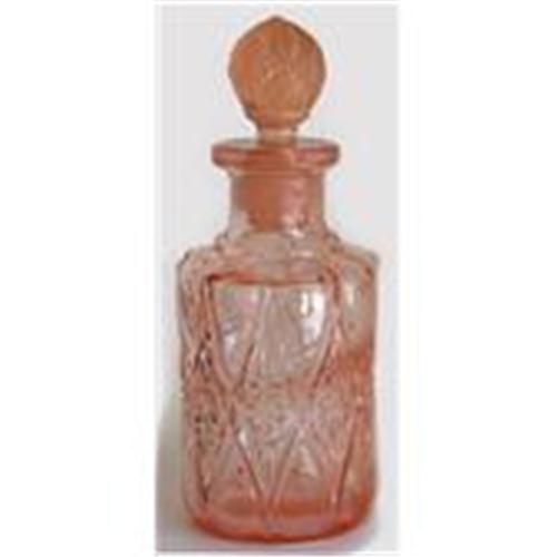 This lovely pink Depression glass perfume or dresser bottles features an intricate crossed diamond pattern with flowers inside the diamonds, and is repeated on the finial of the stopper. Measuring 6" tall to the top of the ground glass stopper and is in excellent condition. This perfume bottle is the middle size bottle in a set of three matching perfume bottles in graduating sizes. The other two are available in separate auctions