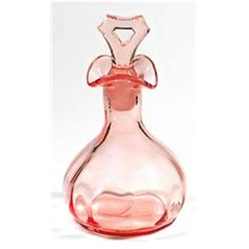 This unusually shaped Pink Depression glass perfume bottle, flask or cruet has a triangular spout, a triangular ground glass stopper and was produced during the 1930s by the Cambridge Glass Co. Measuring 5 inches tall and 3 1/4 inches across bottom, both the bottle and stopper are in excellent condition. - There is a second matching bottle for sale in a separate auction.