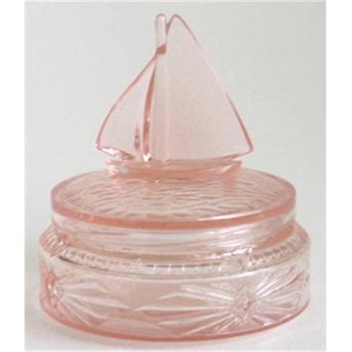 Known as Sailboat and shown on page 51 of Whitmyer - Bedroom & Bathroom Glassware of the Depression Years. The lid is embossed with waves, the finial is a sailboat with a large double sail, the jar is decorated with sunrays and diamonds. Measuring about 5 1/2" tall to the top of the sail, and 3 1/2" in diameter this jar and lid are in excellent condition.