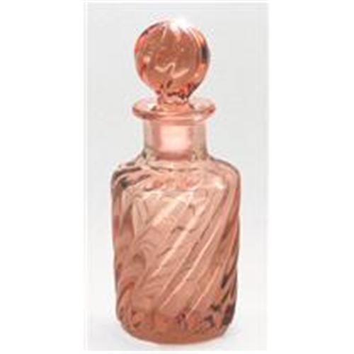 Produced during the 1930s - 1940s this thick and heavy pink Depression glass perfume or lotion bottle measures 5 1/4 inches tall x 1 3/4 inches across its base. Featuring a swirled pattern, swirling right to left, on both the bottle and ground glass stopper. Both the bottle and its stopper are in excellent condition.