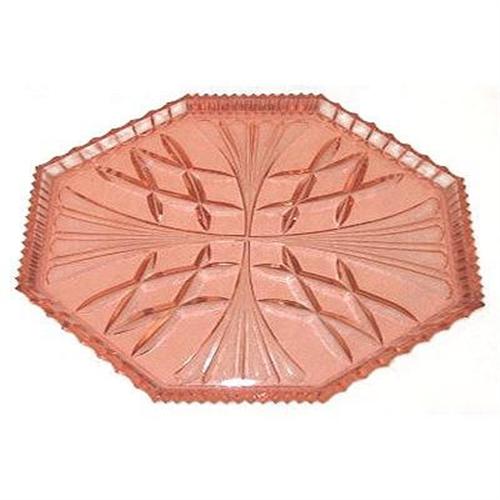 This very ggod quality Art Deco pink Depression Glass dresser tray was produced, most likely in Bohemia, circa 1920s-1930s. Featuring a difficult to describe ornate pattern,[see photos] an octagonal shape with four scalloped and four serrated rims. Measures 12 x 8 inches, and, with the exception of a tiny nick on the outside rim,is in excellent condition.
