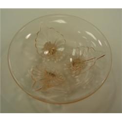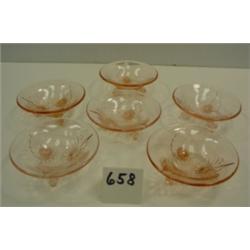 Pink depression glass nut cups. Set of 6 "Jack-in-the-Pulpit" on three feet. 1.5" x 3" wide. Condition: Excellent.