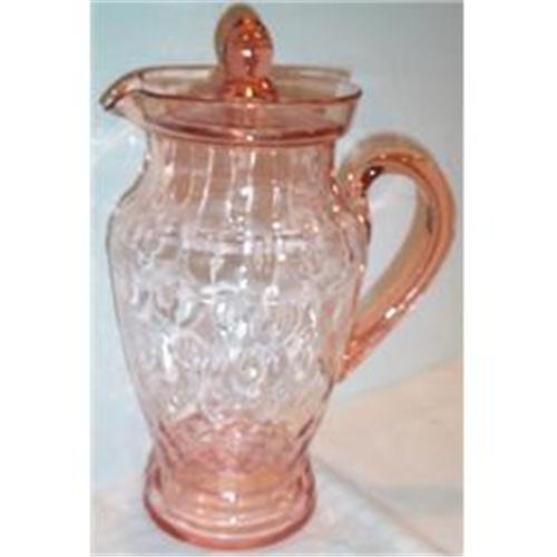 <tr><td>Title:Pink Depression Optic Covered Lemonade Pitcher</td></tr>