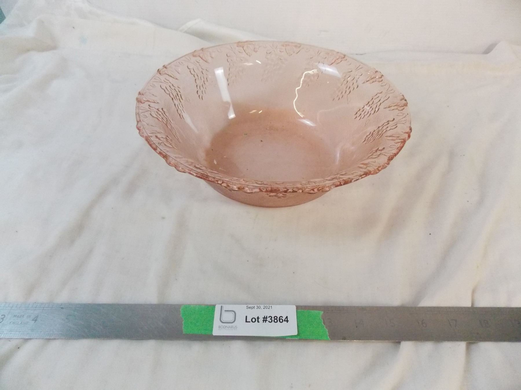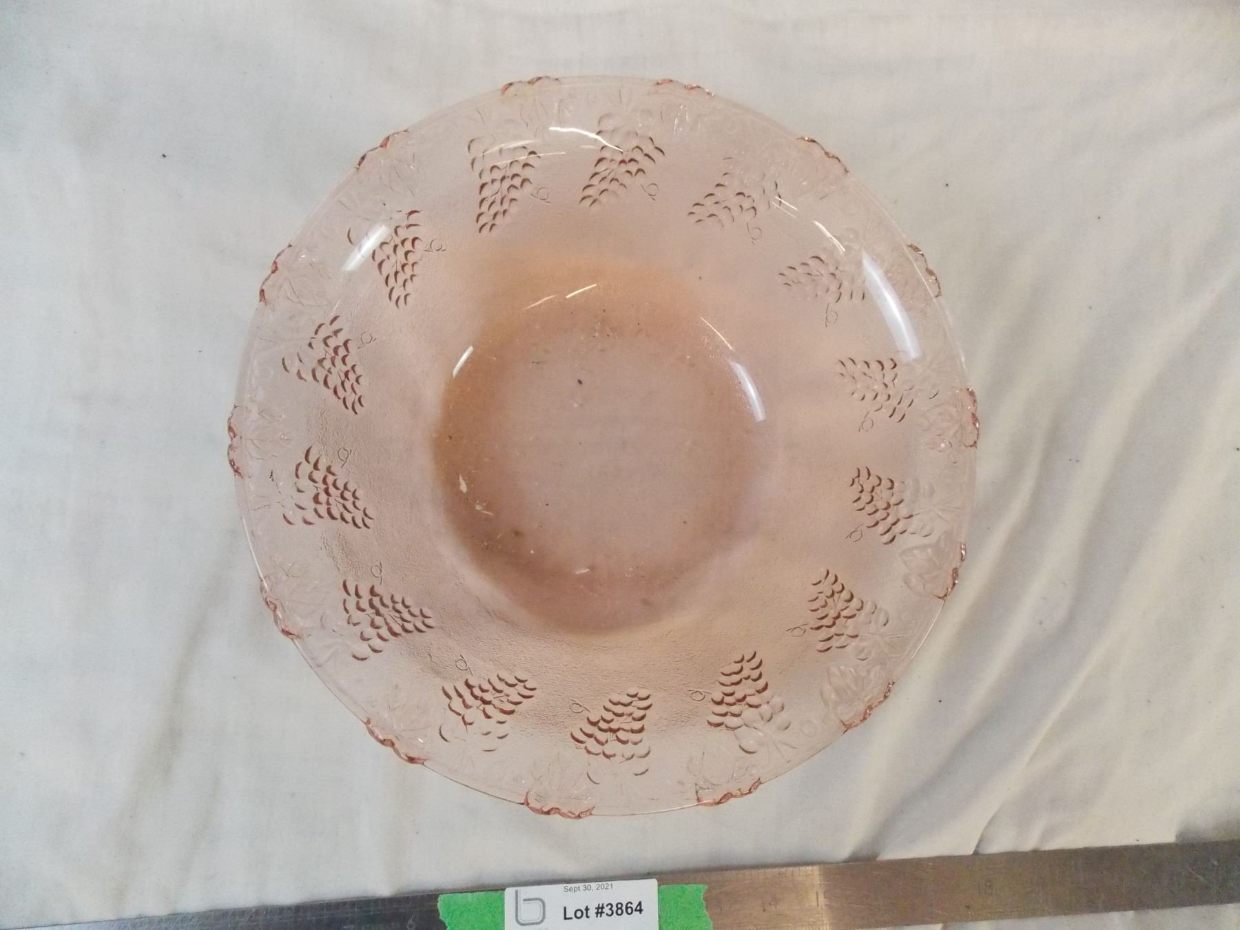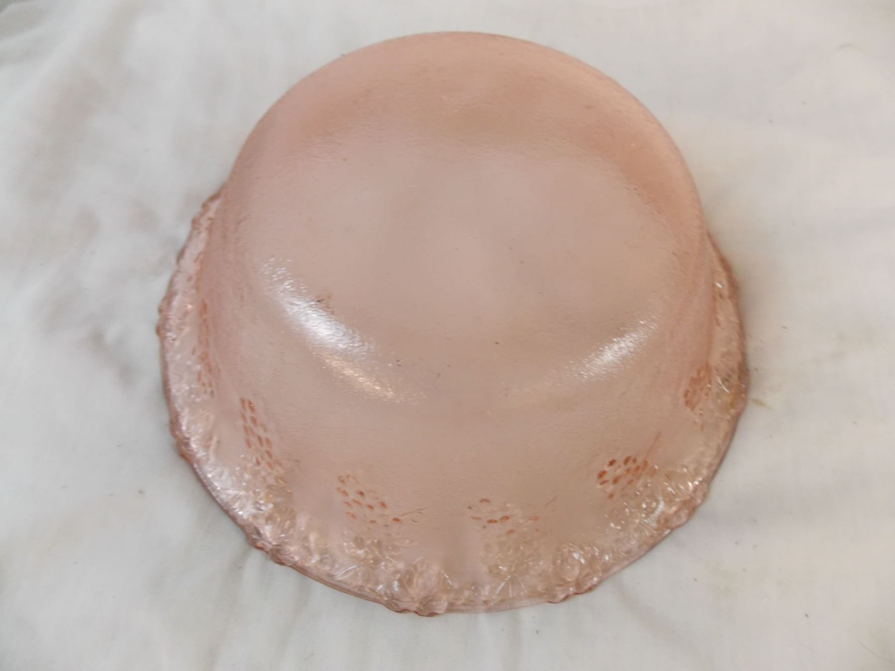 Pink Depression glass type fruit bowl with grape pattern