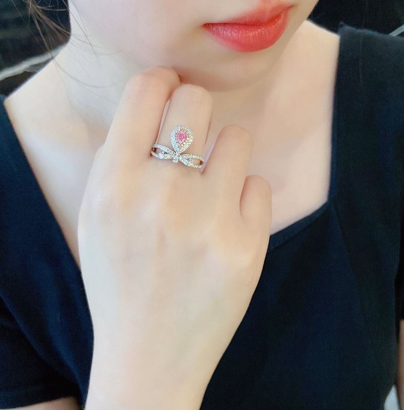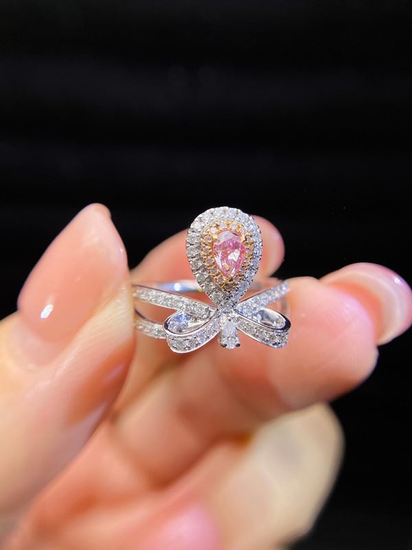 This pink diamond bow knot engagement ring features a captivating pink pear-shaped diamond at the center, surrounded by sparkling white diamonds. Inspired by an elegant bow, the delicate diamond arrangement creates a romantic atmosphere, perfectly blending luxury and sweetness.Ring size: 6, circumference: 52 mm, diameter: 16.6 mm, main diamond: 0.27 ct, side diamonds: 0.452 ct. Note: Comes with a GIA Natural Diamond Report.