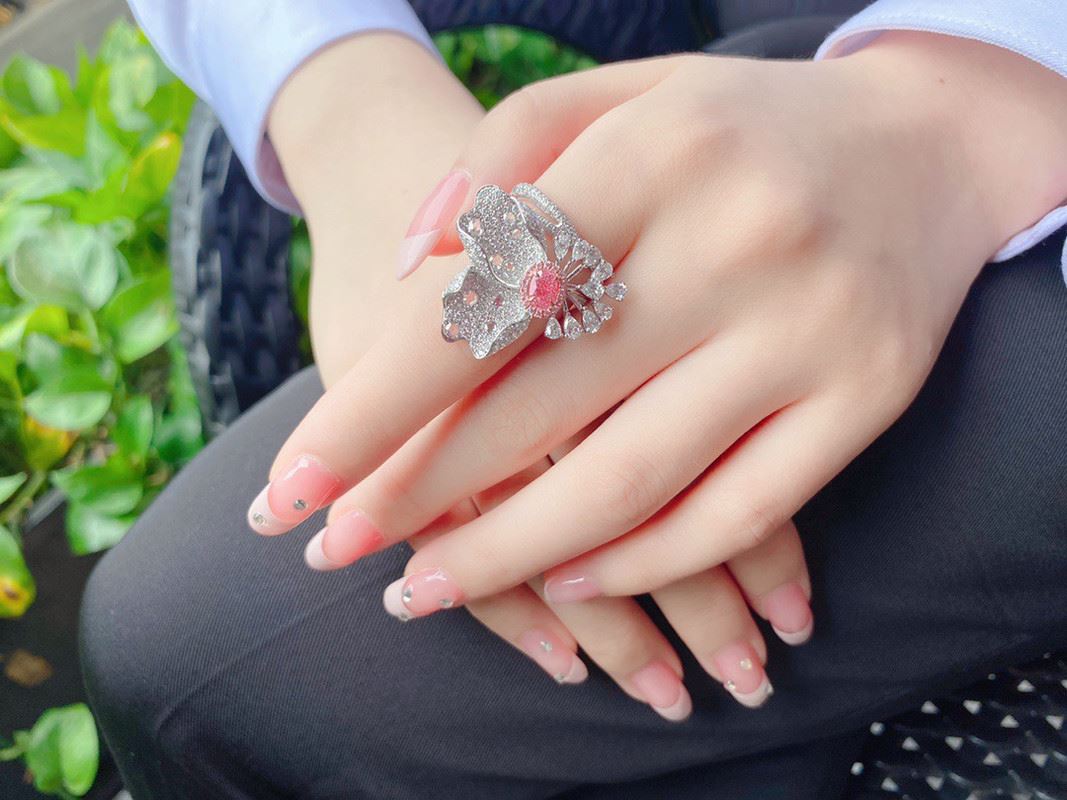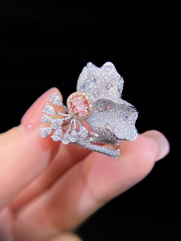 Inspired by the gentle flutter of a butterfly, this ring features an oval pink diamond encircled by a rose-gold halo, radiating soft blush tones. The wings, sculpted in pavé white diamonds, curve gracefully to form a dimensional, luminous silhouette. A poetic design that captures both delicacy and strength—an emblem of feminine grace and freedom. Ring size: 6, circumference: 52 mm, diameter: 16.6 mm, main diamond: 0.53 ct, side diamonds: 2.296 ct. Note: Comes with a GIA Natural Diamond Report.