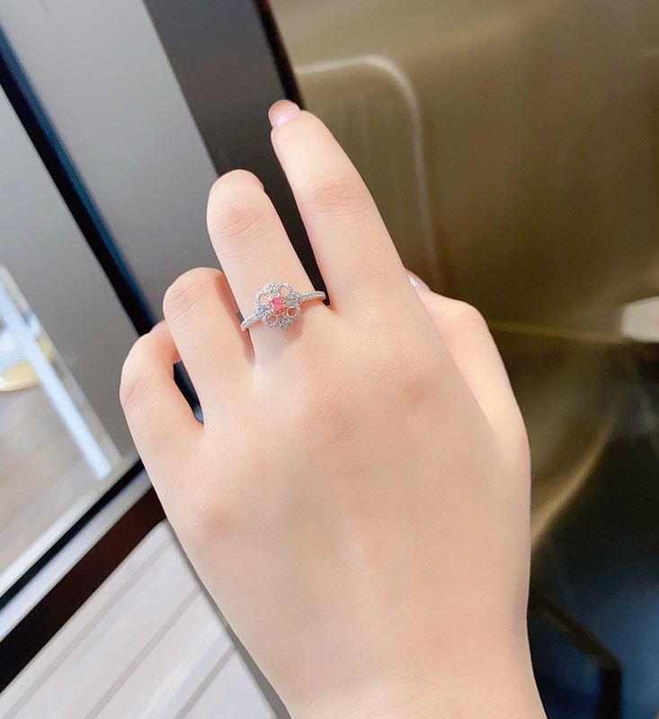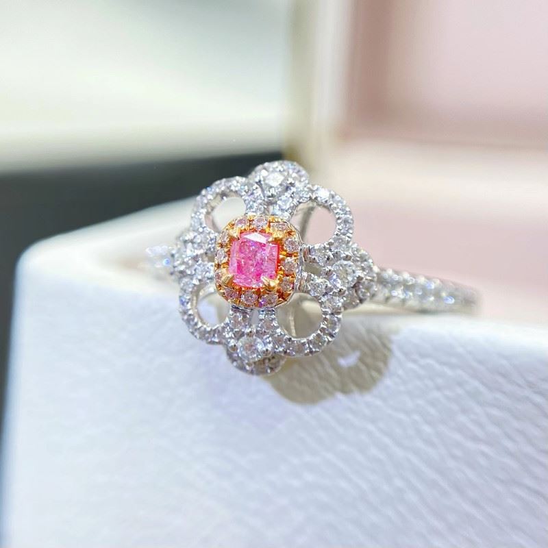 A pink diamond gleams at the center, framed by white diamonds forming a clover motif. Symbolizing luck and love, this ring radiates delicate sparkle and refined elegance.Ring size: 6, circumference: 52 mm, diameter: 16.6 mm,main diamond: 0.078 ct, side diamonds: 0.284 ct. Note: Comes with an AGL certificate and a domestic jewelry identification certificate.