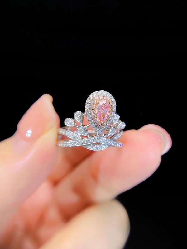 This pink diamond crown ring is inspired by the design of a crown, featuring a delicate pear-shaped pink diamond at the center, surrounded by sparkling white diamonds. The soft hue of the pink diamond contrasts beautifully with the brilliance of the surrounding diamonds, creating a regal and luxurious effect. The ring exudes elegance and romance, making it an ideal choice to showcase a woman’s noble aura and refined taste.Ring size: 6, circumference: 52 mm, diameter: 16.6 mm, main diamond: 0.33 ct, side diamonds: 0.472 ct.Note: GIA Natural Diamond Report.