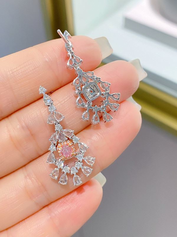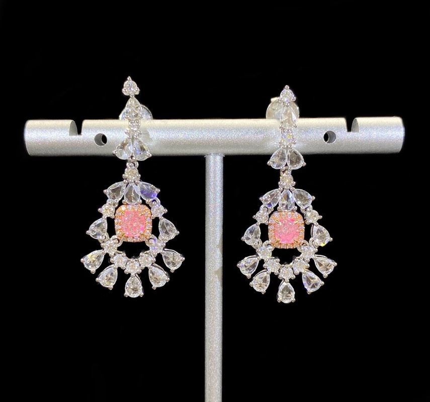 These pink diamond earrings feature rare pink diamonds at the center, surrounded by layers of brilliant white diamonds arranged in a radiant design. The soft blush hue of the pink diamond contrasts beautifully with the sparkling brilliance of the white stones, creating a perfect harmony of romance and elegance. Exquisitely crafted and timelessly stylish, these earrings embody luxury and refined femininity.Main diamond: 0.67 ct, side diamonds: 1.97 ct.Note: GIA Natural Diamond Report.
