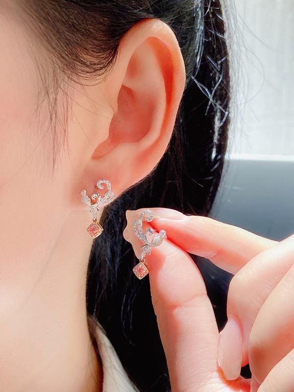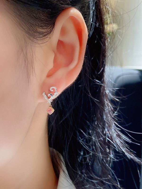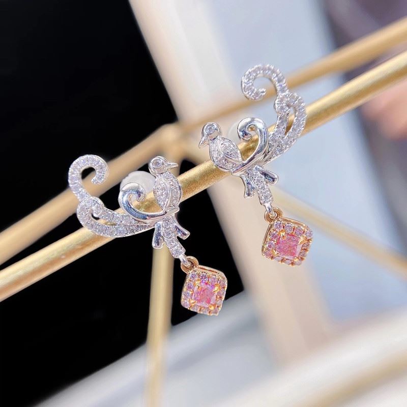 These pink diamond earrings feature radiant square-cut pink diamonds surrounded by a halo of delicate blush stones. The upper phoenix-inspired diamond motif adds an air of grace and symbolism, representing beauty, luck, and love. Elegant and feminine, this design perfectly balances artistic detail with luxurious brilliance — a statement piece for refined women who appreciate timeless romantic allure.Main diamond: 0.156 ct, side diamonds: 0.246 ct.Note: Comes with a precious metal authentication certificate.