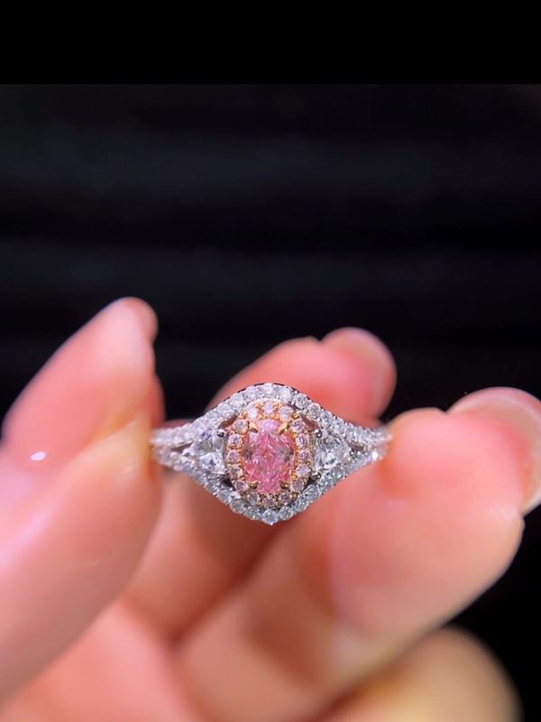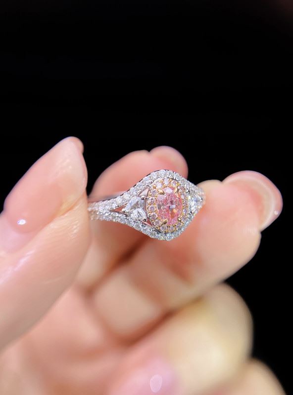This pink diamond engagement ring features a beautiful pink oval diamond at the center, surrounded by sparkling white and pink diamonds. The elegant and romantic design, combined with the delicate arrangement of diamonds, radiates unparalleled luxury and sophistication.Ring size: 6, circumference: 52 mm, diameter: 16.6 mm, main diamond: 0.30 ct, side diamonds: 0.514 ct. Note: Comes with a GIA Natural Diamond Report.