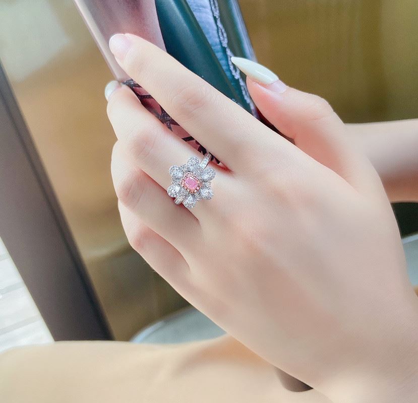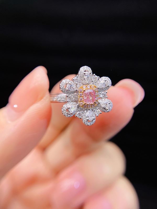 This pink diamond floral engagement ring features a delicate pink square diamond at the center, surrounded by sparkling pear and round diamonds, resembling a blooming flower. The meticulous arrangement of diamonds highlights the ring’s elegance and unique charm, exuding romance and luxury.Ring size: 6, circumference: 52 mm, diameter: 16.6 mm, main diamond: 0.26 ct, side diamonds: 0.708 ct. Note: Comes with a GIA Natural Diamond Report.
