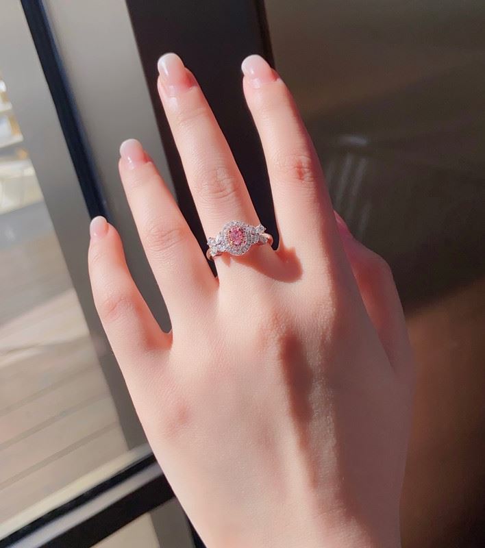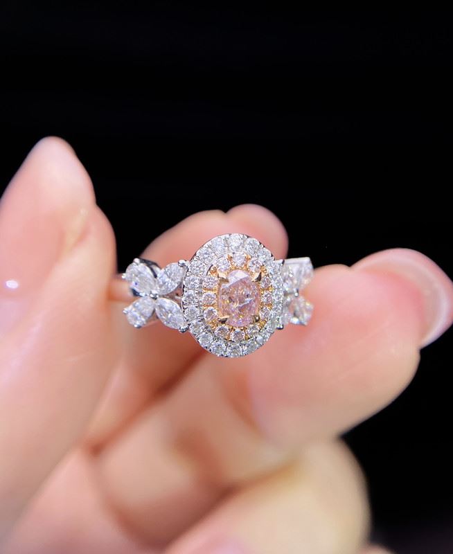 This pink diamond oval engagement ring features an exquisite pink oval diamond at the center, surrounded by dazzling white and pear-shaped diamonds. The elegant and captivating design highlights the perfect blend of luxury and romance, with each diamond’s brilliance shining together.Ring size: 6, circumference: 52 mm, diameter: 16.6 mm, main diamond: 0.25 ct, side diamonds: 0.586 ct. Note: Comes with a GIA Natural Diamond Report.