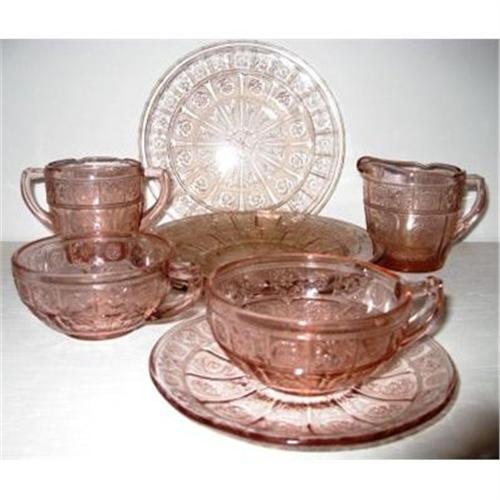 We are offering you this fantastic and quite hard-to-find Childs Depression Glass Pink Doric and Pansy set all for one money. This set will consist of: Three Plates measuring 5.875" in diameter, two (2) cups meausring 3" in diameter and standing 1.50" tall, One (1) saucer that is 4.50" in diameter, one (1) creamer that is 3.50" from spout to handle and 2.50" in diameterand standing 2.75" tall, and finally one sugar that is 3.75" fromhandle to handle, 2.75" in diameter and standing 2.50" tall. All of the items in this set that we are offering are in SUPERIOR condition with no chips, cracks, or dings.