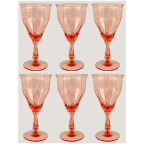 This lovely set of six pink Elegant Depression glass goblets have a gently flared bowl, a ribbed or panel optic design and alovely sculpted stem. They each measure 7" tall x just under 3 1/2" across the rim. This gorgeous goblet set sparkles brilliantly when light hits them and are in excellent condition