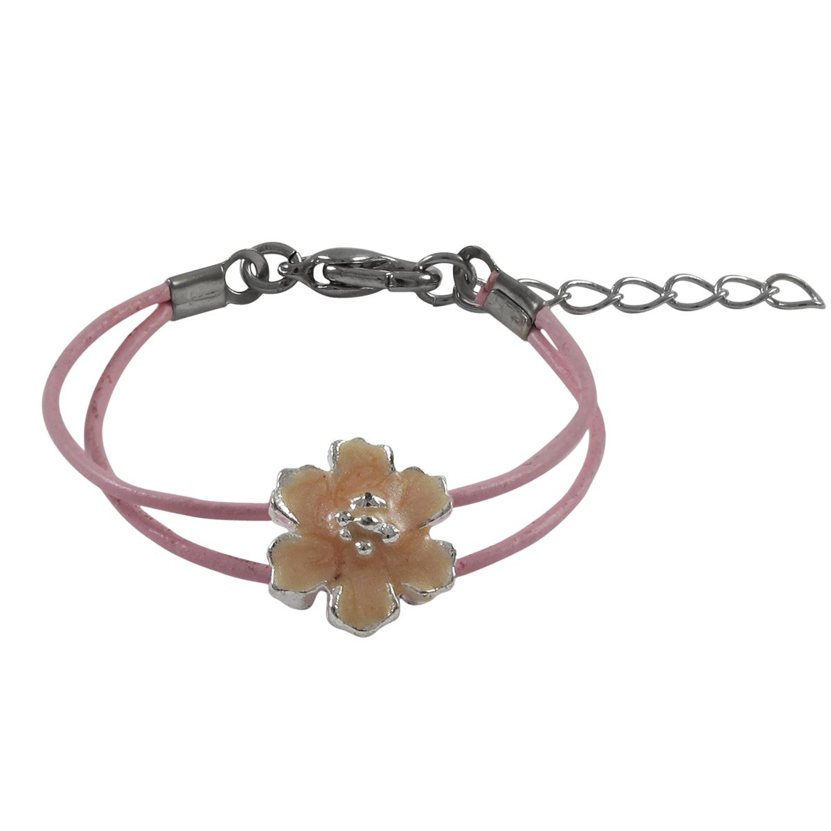 Pink Enamel 12Mm Flower On Two Row Pink Cord, Rhodium Plated Brass Bracelet, 4" 1"