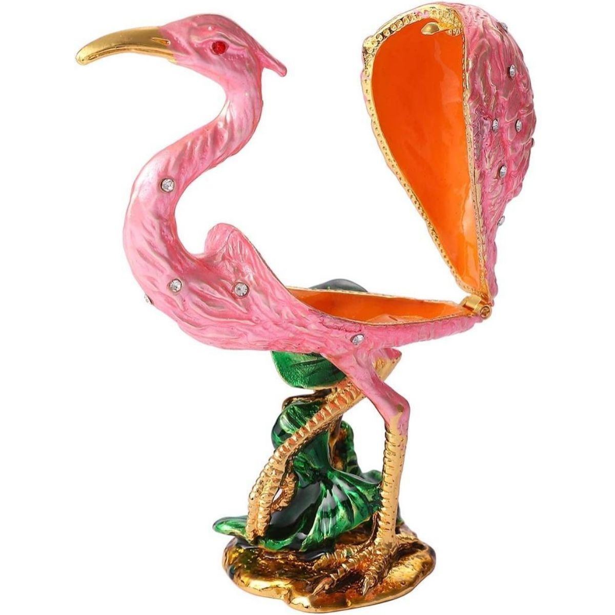 Pink Flamingo bird trinket, jewel box. Enamel & gilt over pewter with clear & colored embedded rhinestones. The back of the bird lifts to reveal an enameled interior for storing trinkets or jewels. 4" H X 3" L X 2" W. Comes with gift box.
