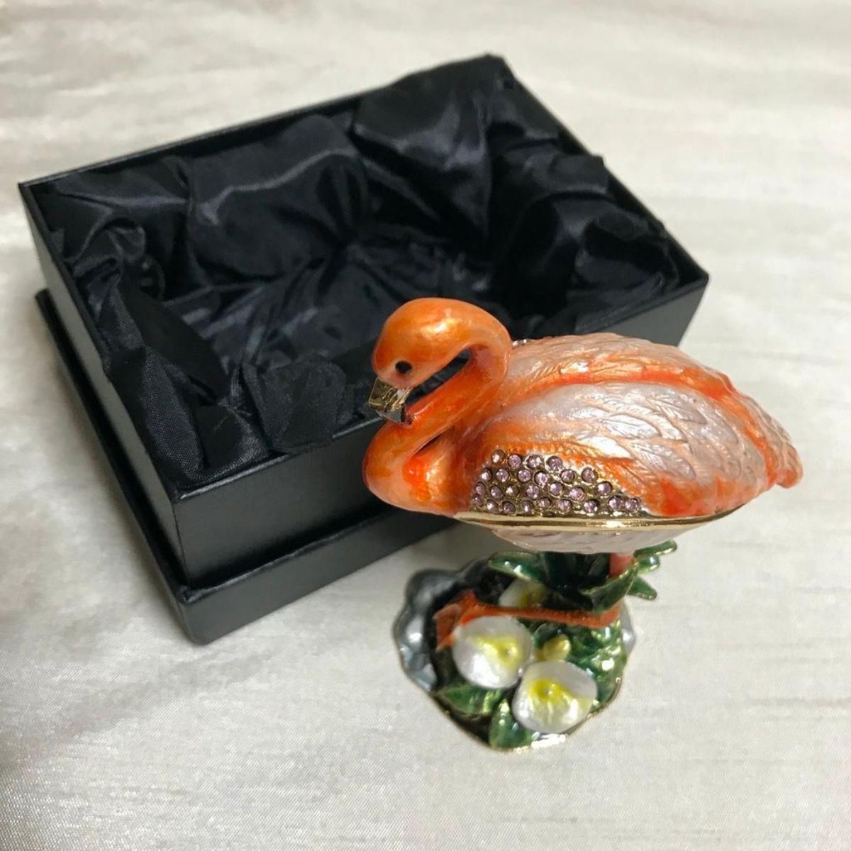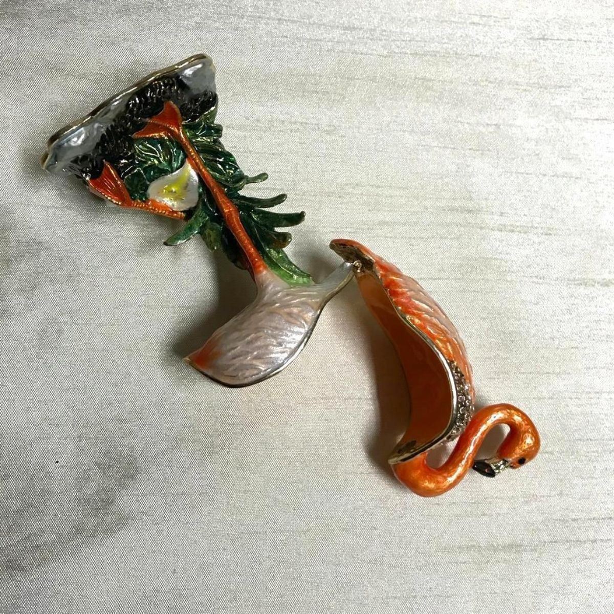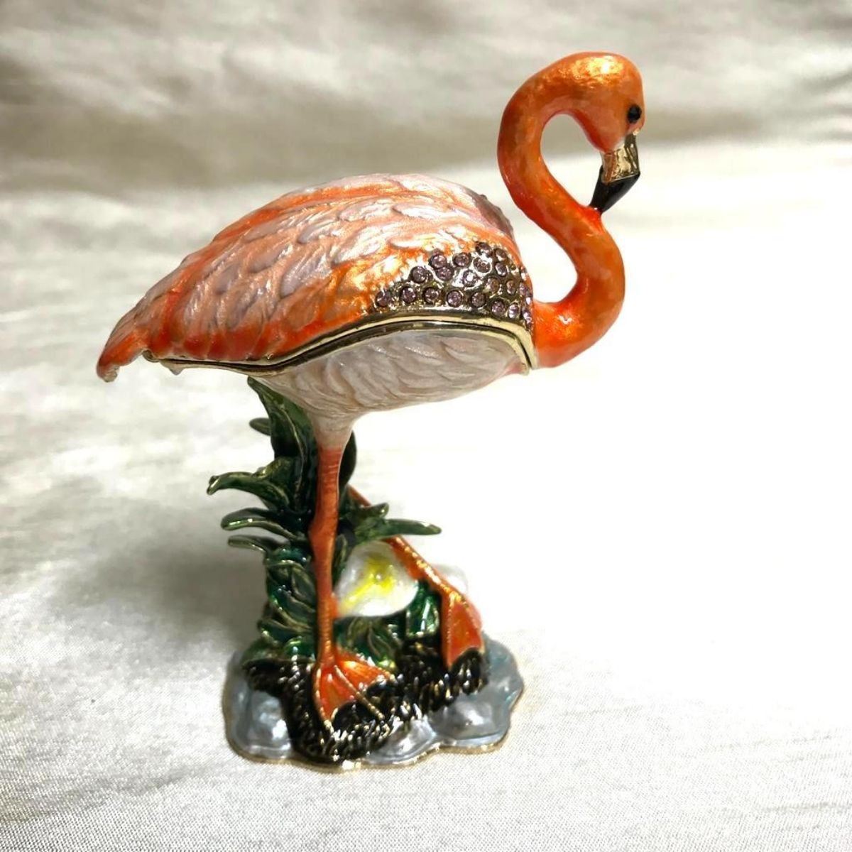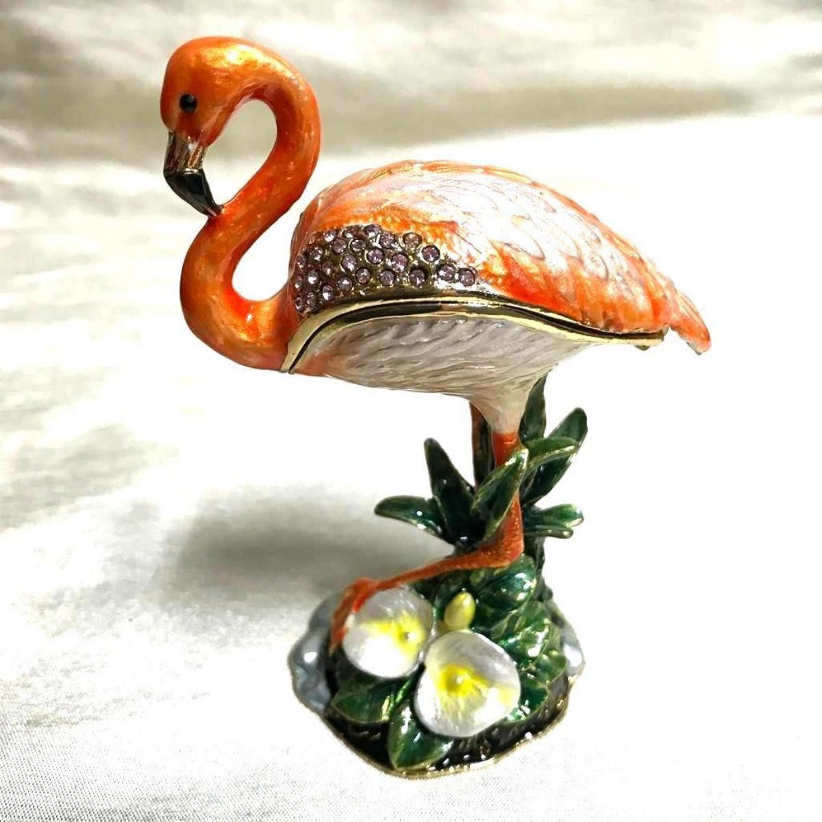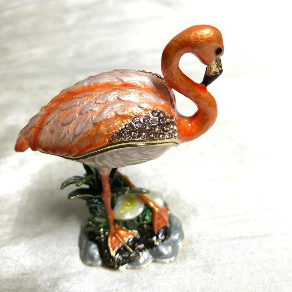 Pink Flamingo, bird theme trinket, jewel box. Opens at center on a hinge, with magnetic closure, to reveal an enameled hiding place for jewels or trinkets. Hand-painted orange & pink enamel main colors, with gold gilt over pewter & embedded Austrian crystals. A lovely piece. 4