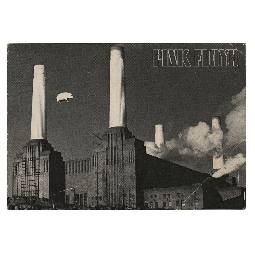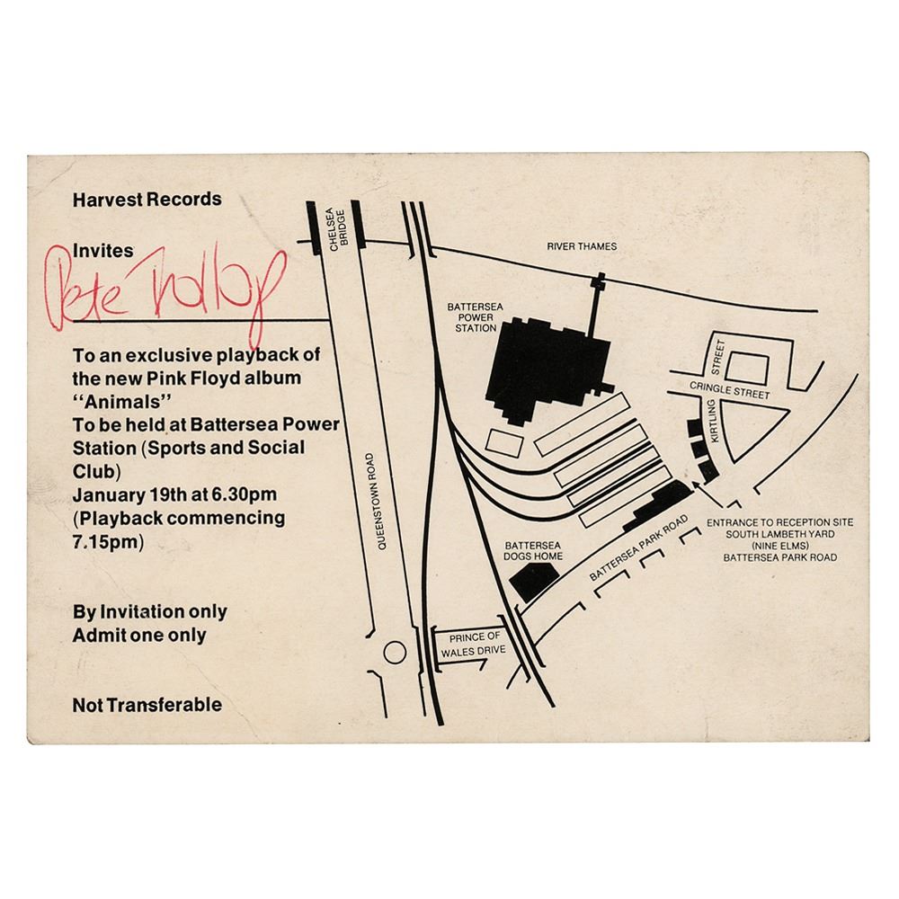 Uncommon original invitation from Harvest Records, 6 x 4.25, for “an exclusive playback of the new Pink Floyd album ‘Animals,’” to be held at the Battersea Power Station in London, England, on January 19, 1977, just two days before the album was released. The front features ‘flying pig’ imagery similar to the album’s iconic cover (which pictures Battersea Power Station), and the back lists information text, a map, and the invitee’s name in red ballpoint. In very good to fine condition, with scattered creasing, and a heavier diagonal crease to the lower right corner. Accompanied by a certificate of authenticity from Tracks.